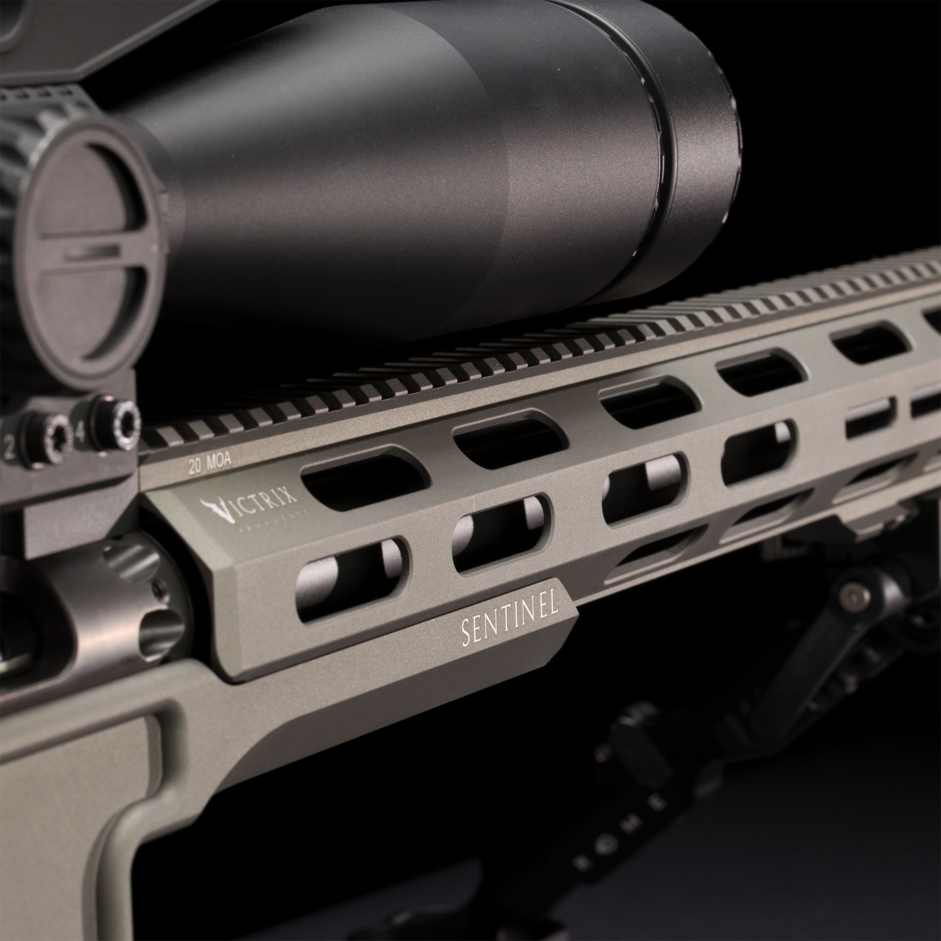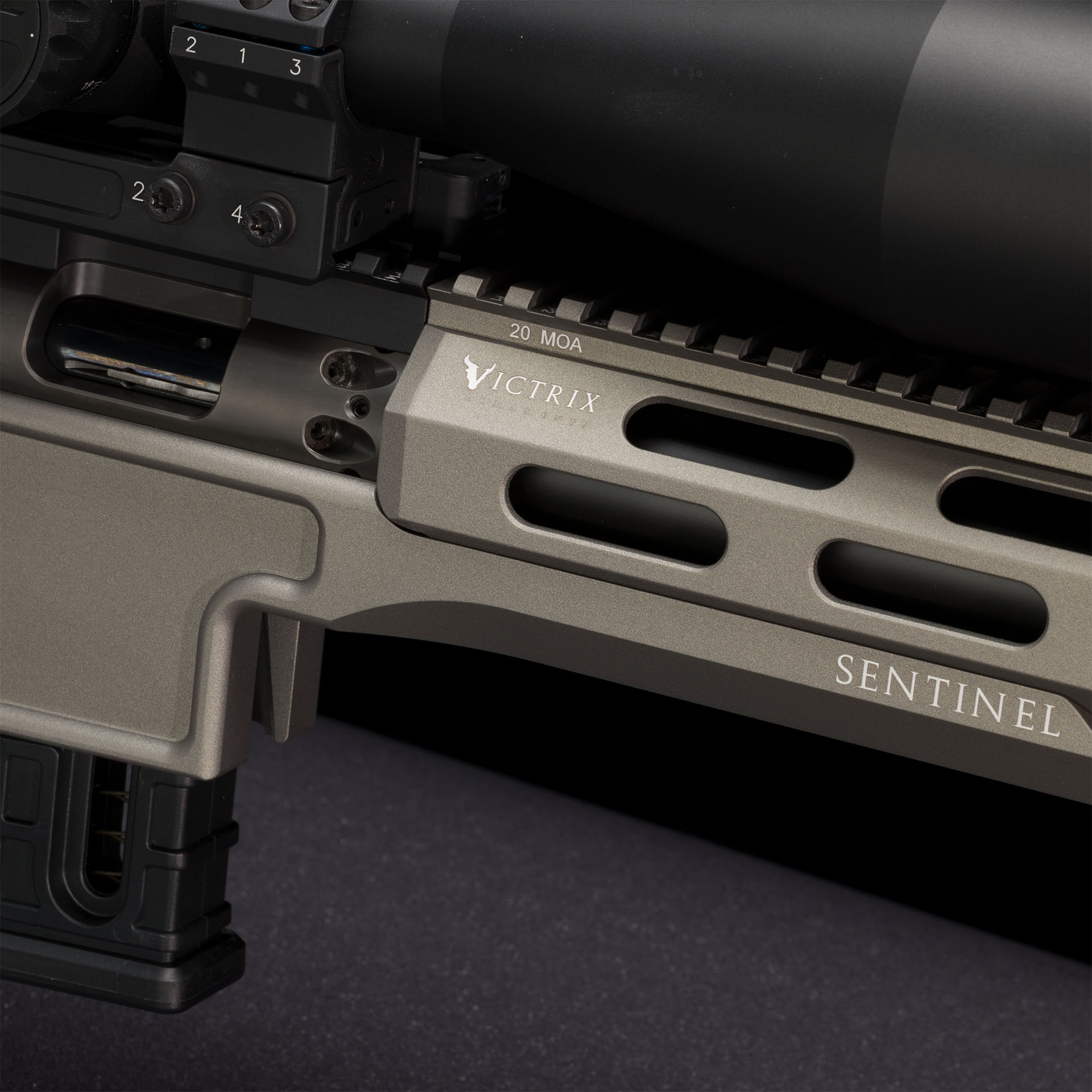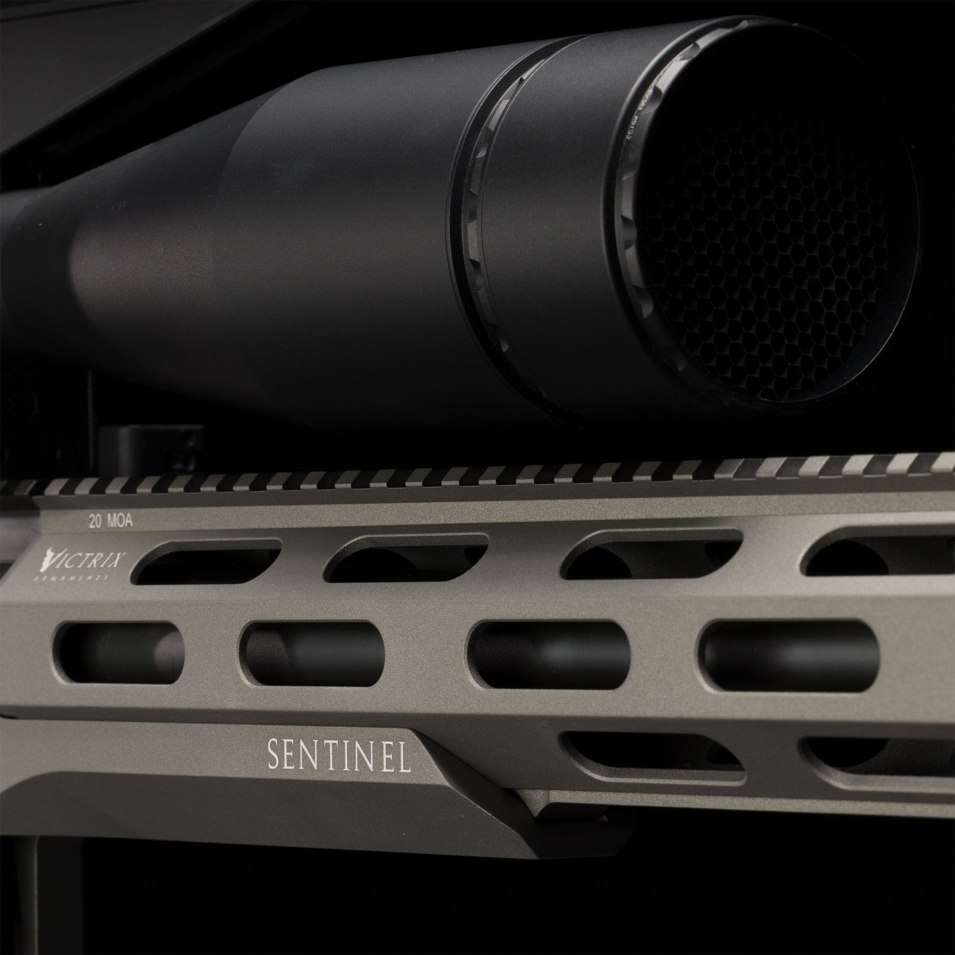 Forend ottagonale in lega leggera con sistema d’attacco laterale, rail superiore monoblocco integrata 20 MoA e rail inferiore monoblocco