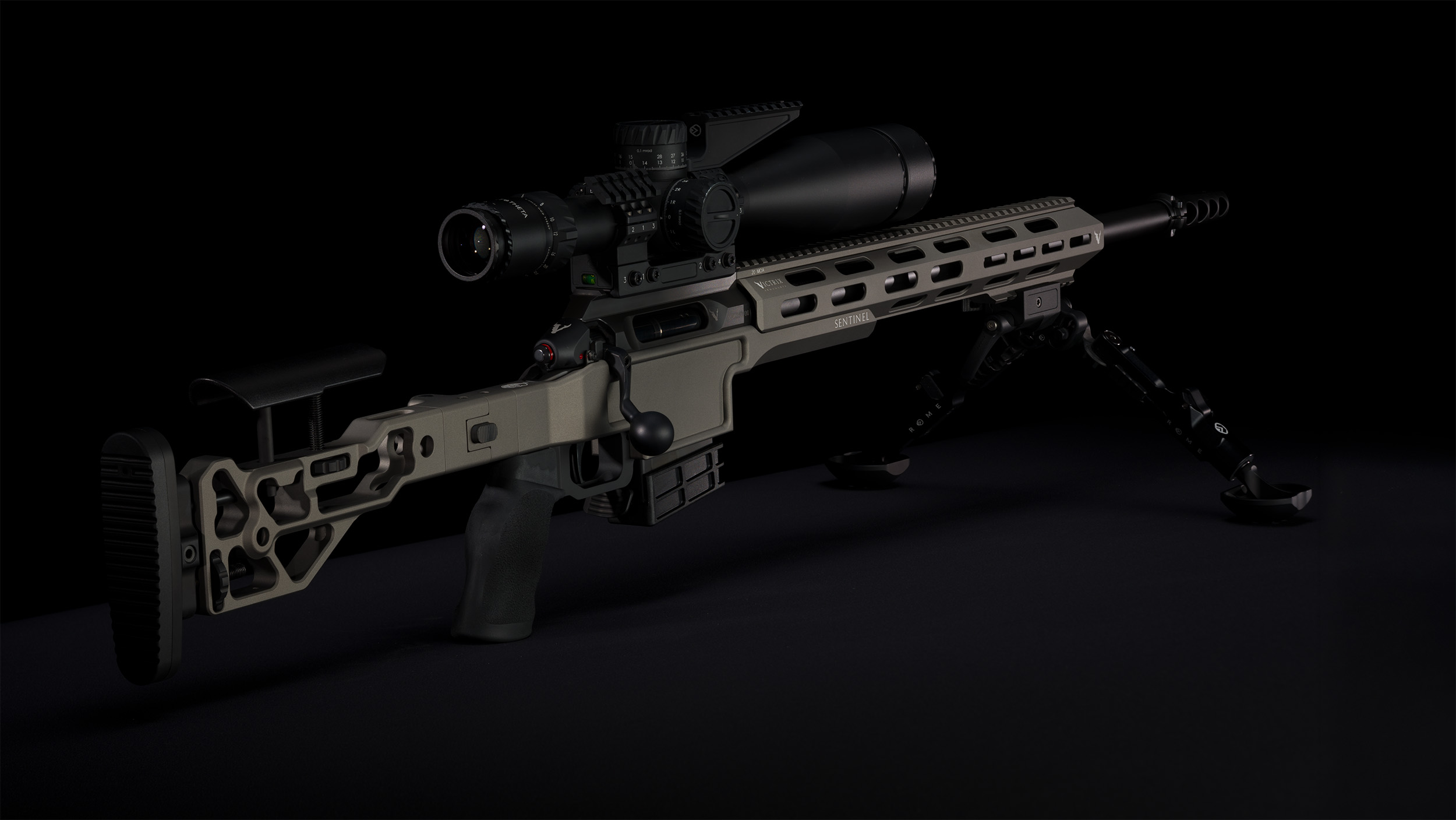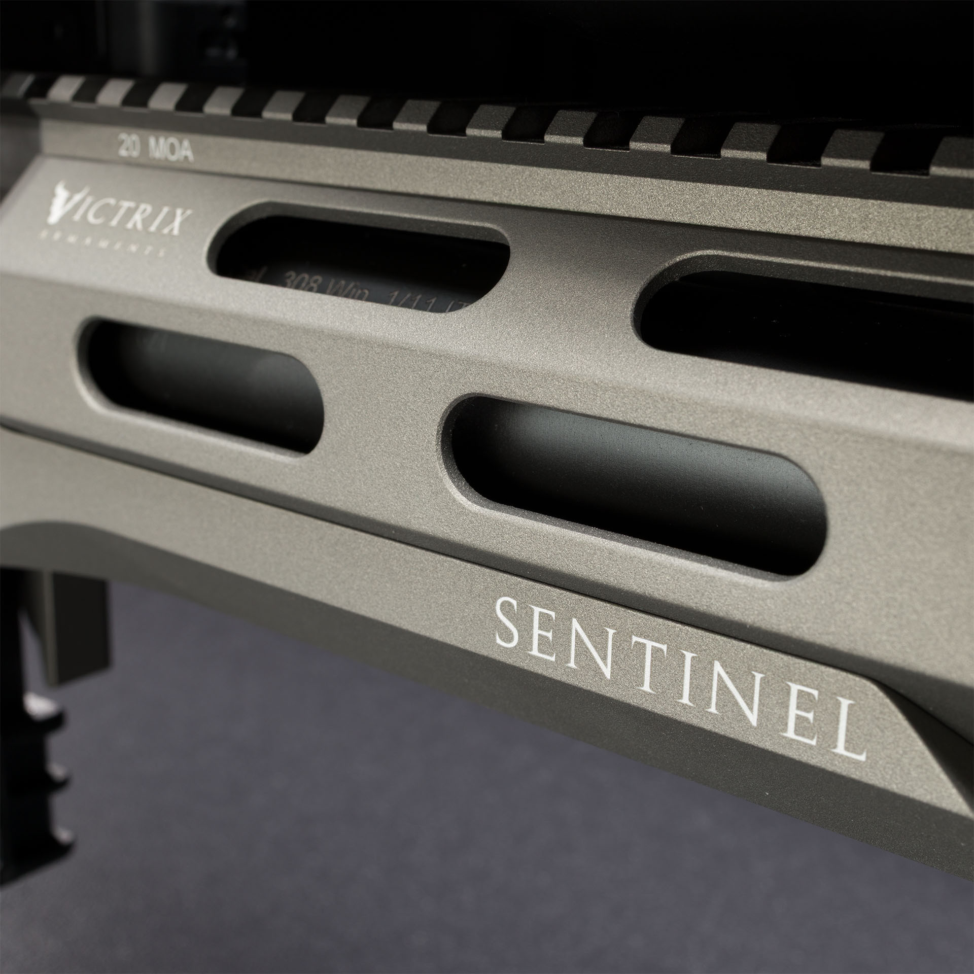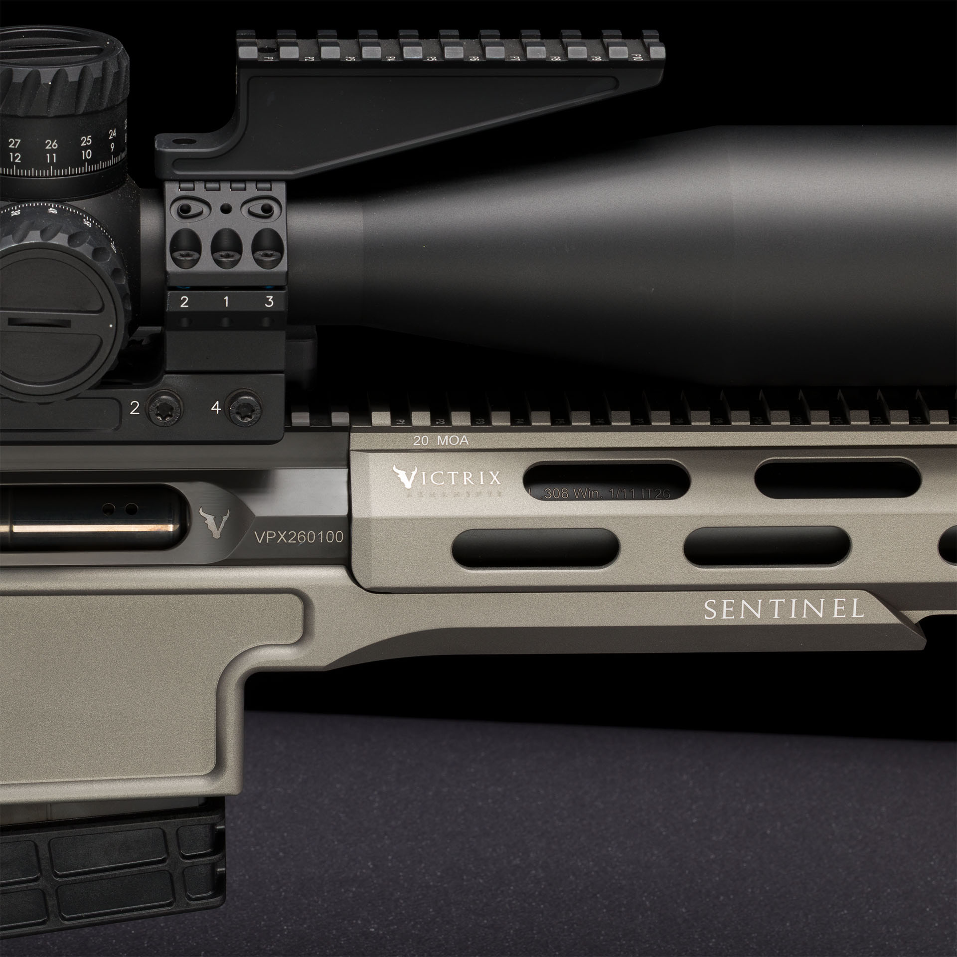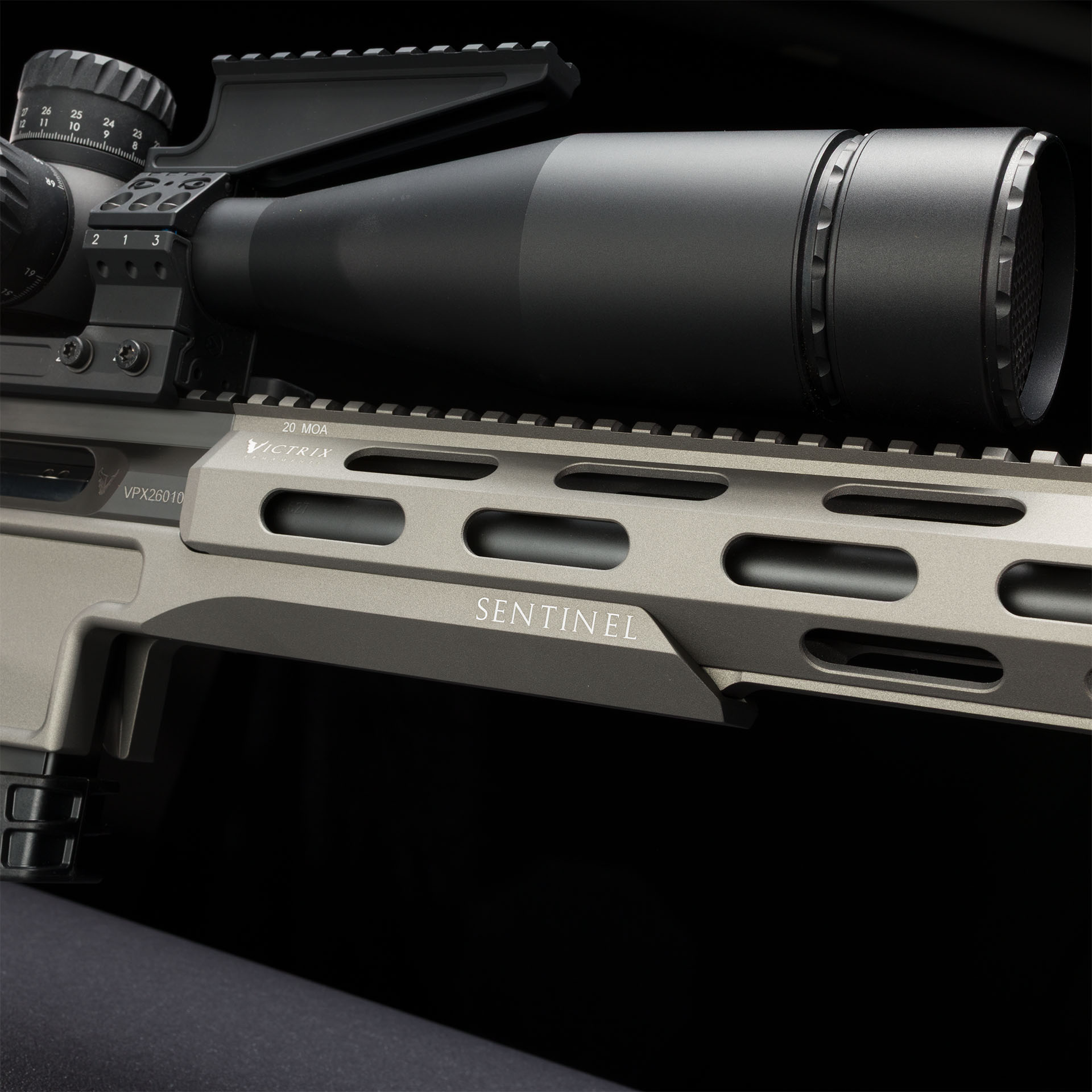 Forend ottagonale in lega leggera con sistema d’attacco laterale, rail superiore monoblocco integrata 20 MoA e rail inferiore monoblocco