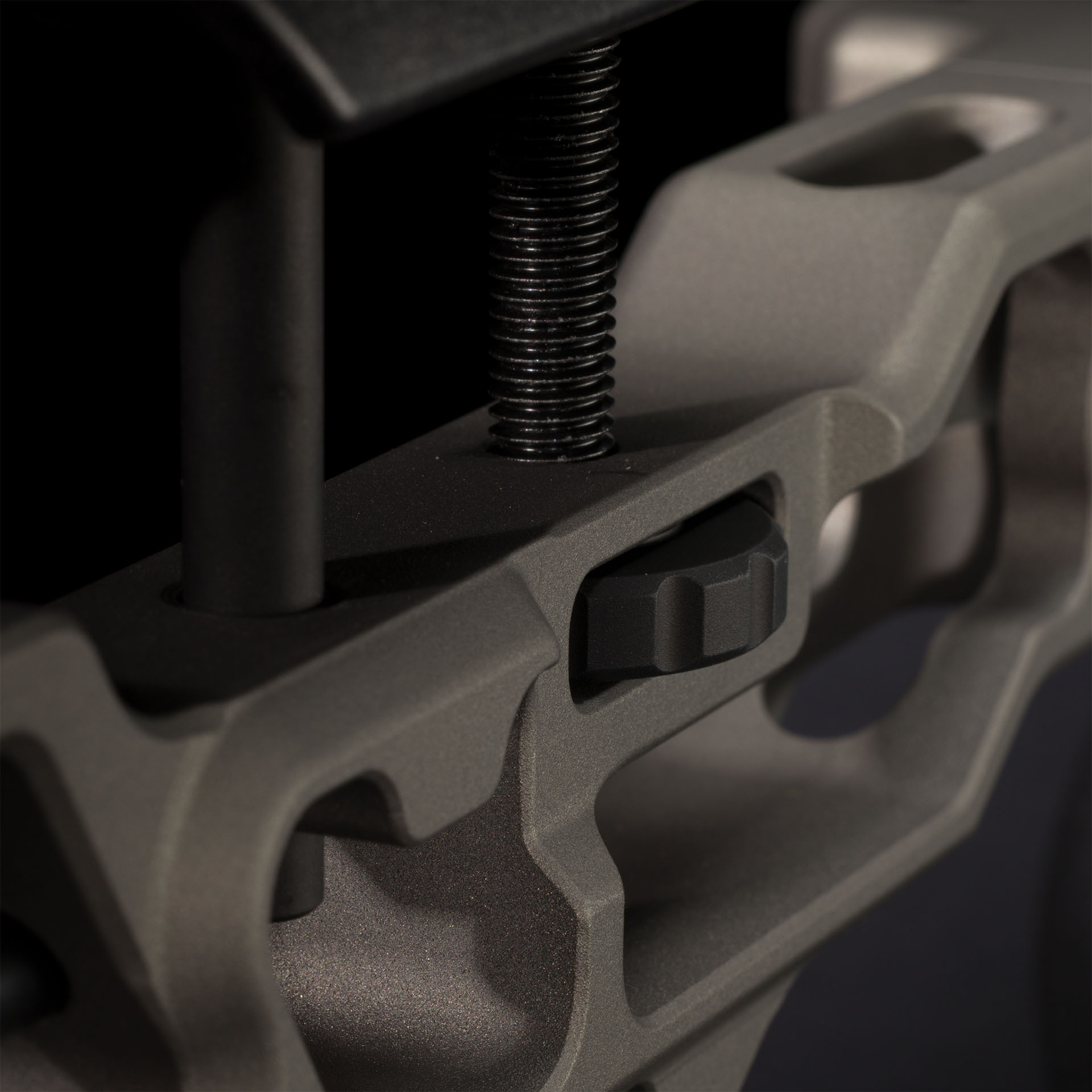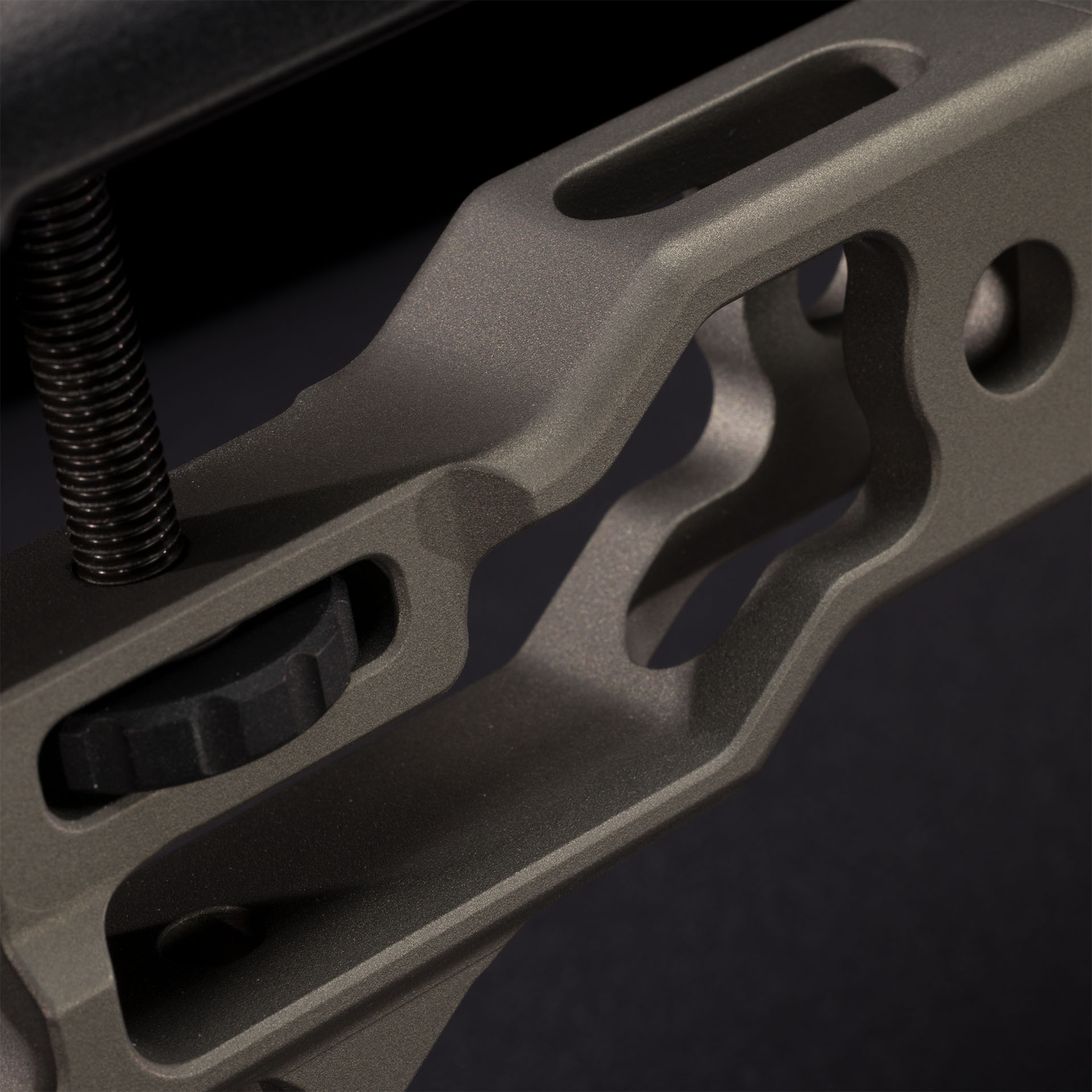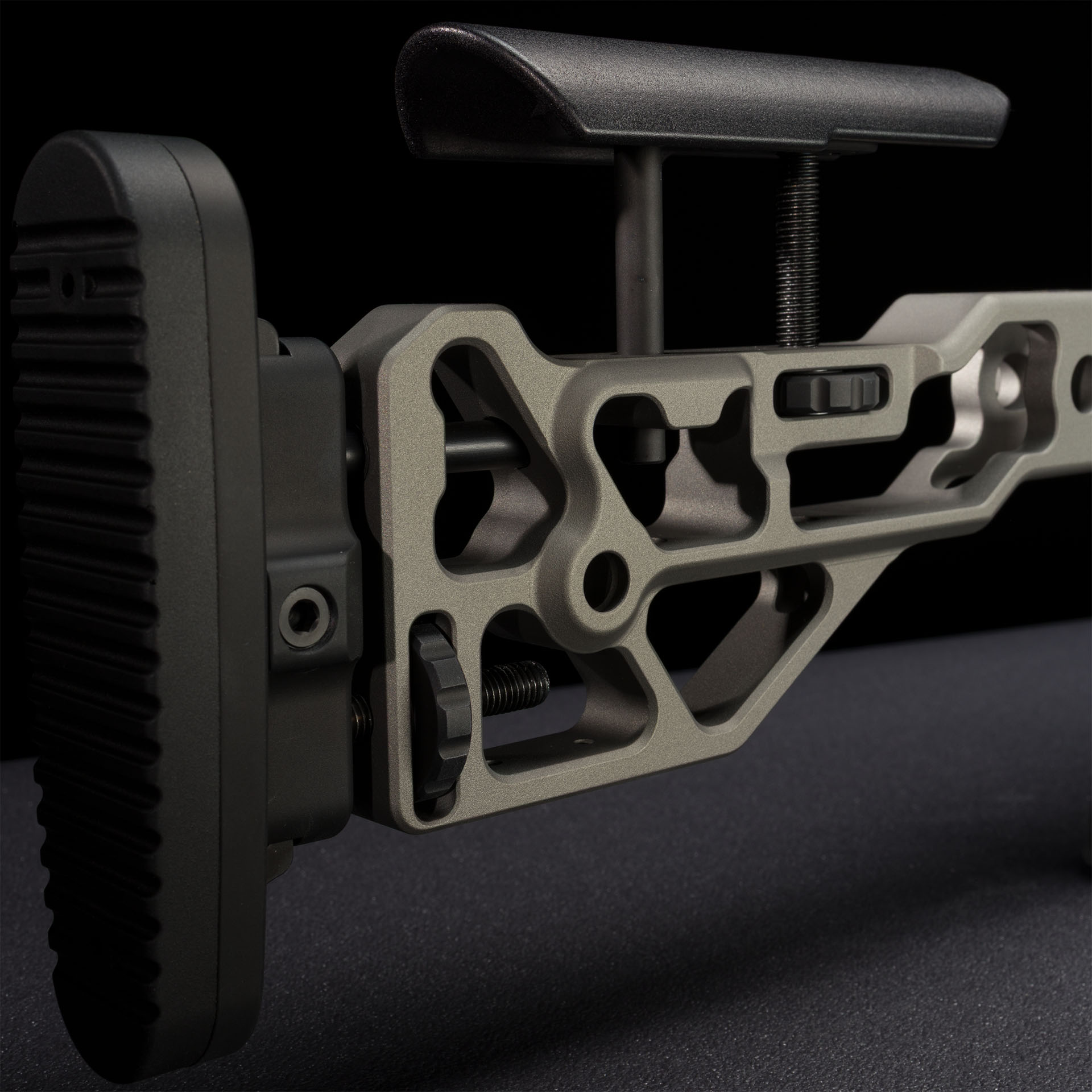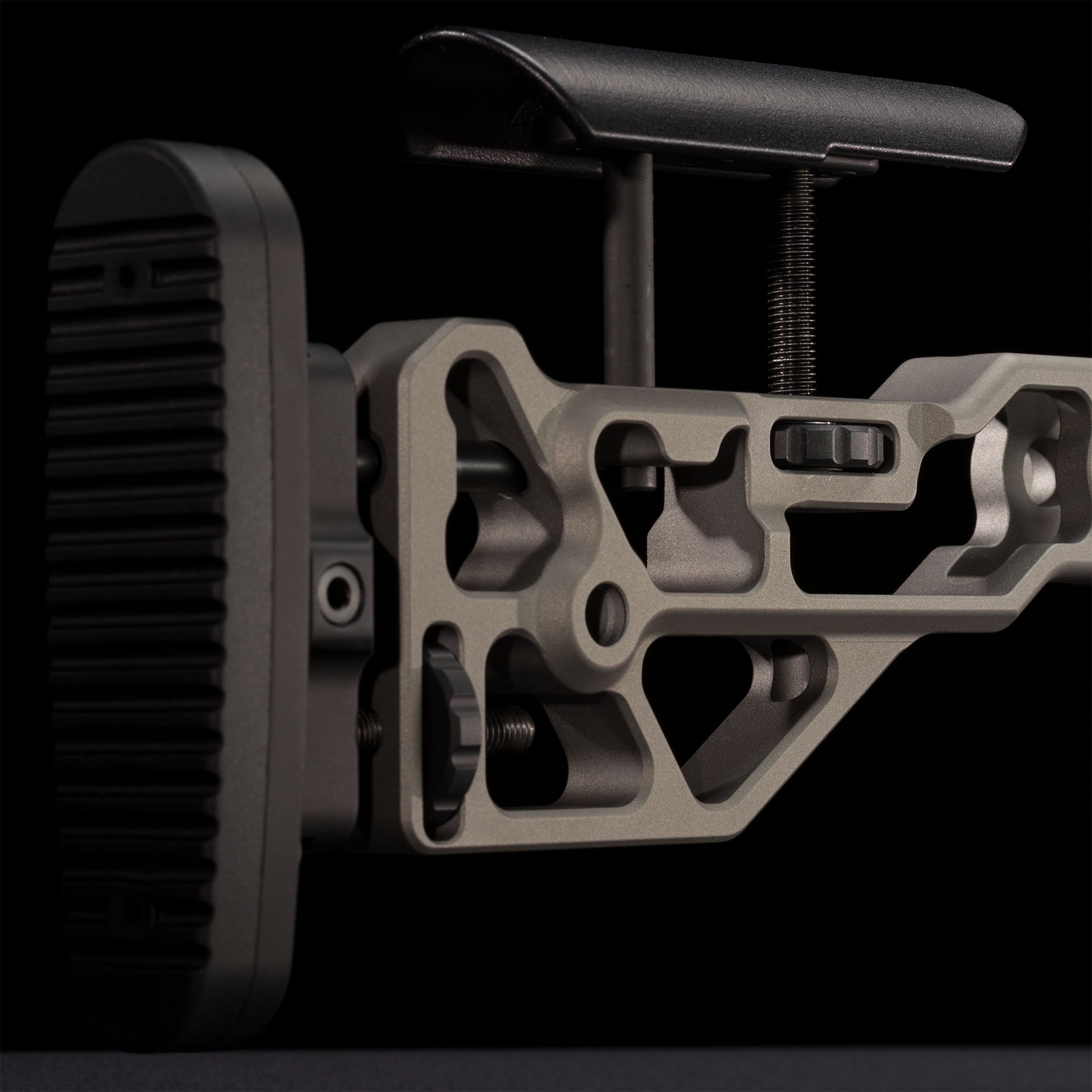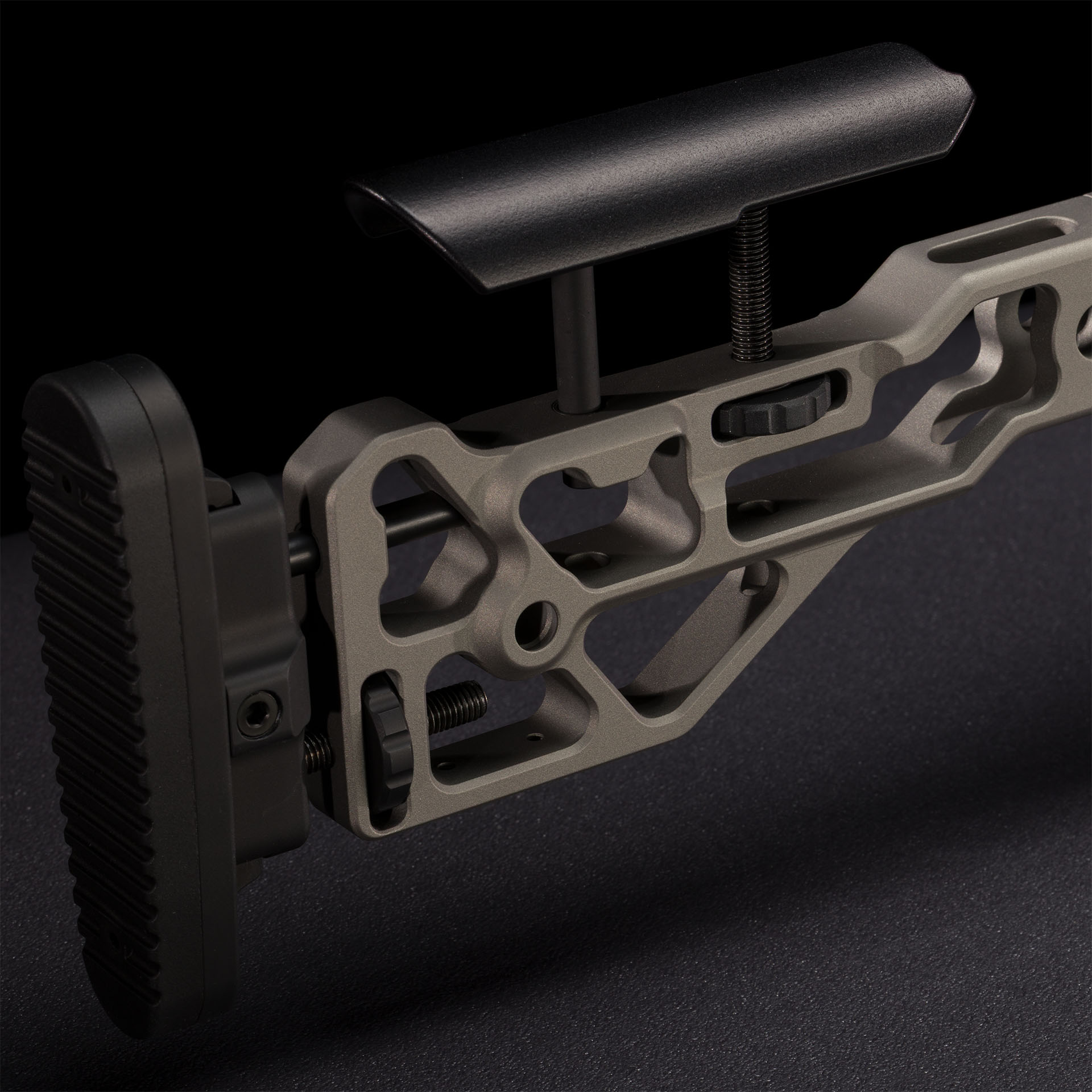 Buttstock con regolazioni multiple tramite ghiera in orizzontale e verticale e poggia guancia regolabile in materiale isolante