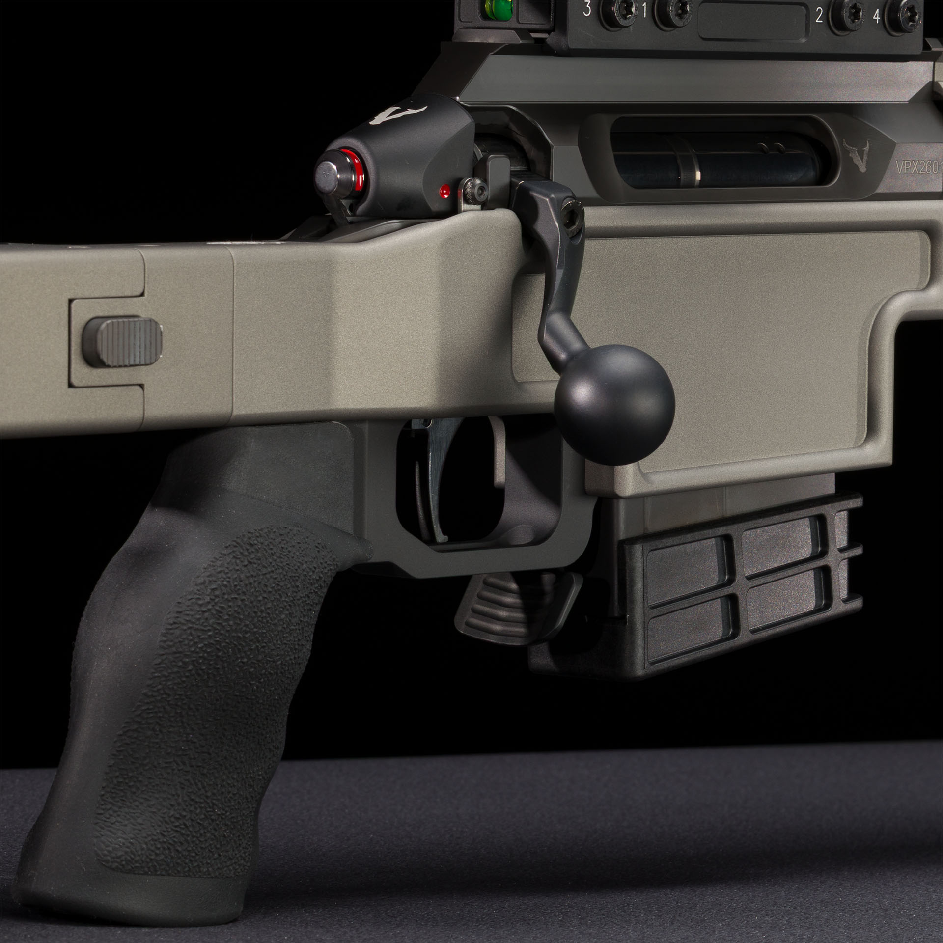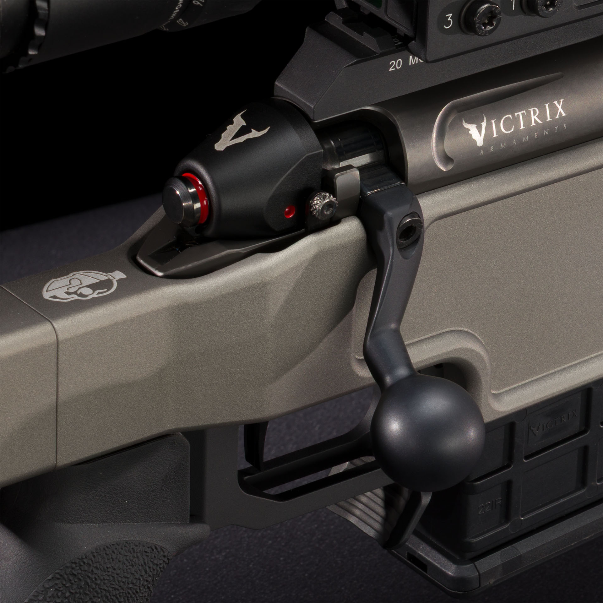 Otturatore a due tenoni asimmetrici posteriori, dotato di sistema di disassemblaggio rapido, doppio estrattore e leva di armamento ergonomica intercambiabile